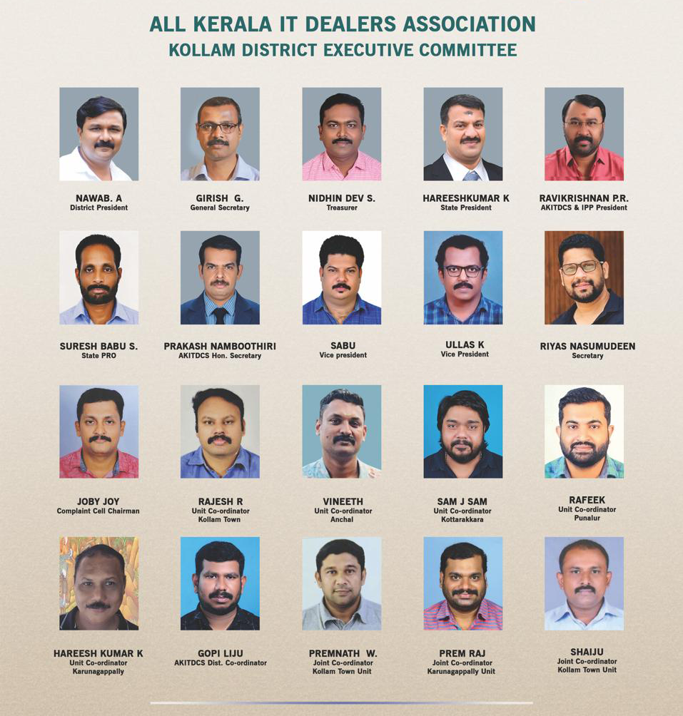 It is with great pride and appreciation that I extend my heartfelt greetings to all members of the Kollam District IT Dealers Association. Our district has consistently demonstrated strength, unity, and commitment in delivering quality IT solutions, and it is a privilege to lead such a dedicated and forward-thinking community.